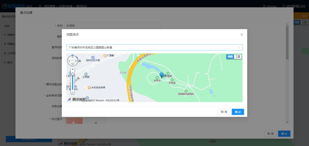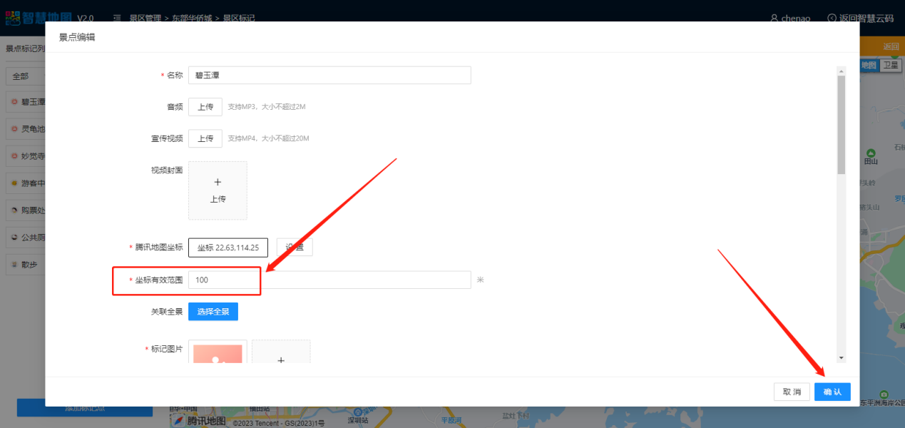 然后點擊確認,即新增景點標記完成。注:坐標有效范圍,在后繼的打卡領紅包卡券活動中,會影響打卡的范圍。如下圖所示: