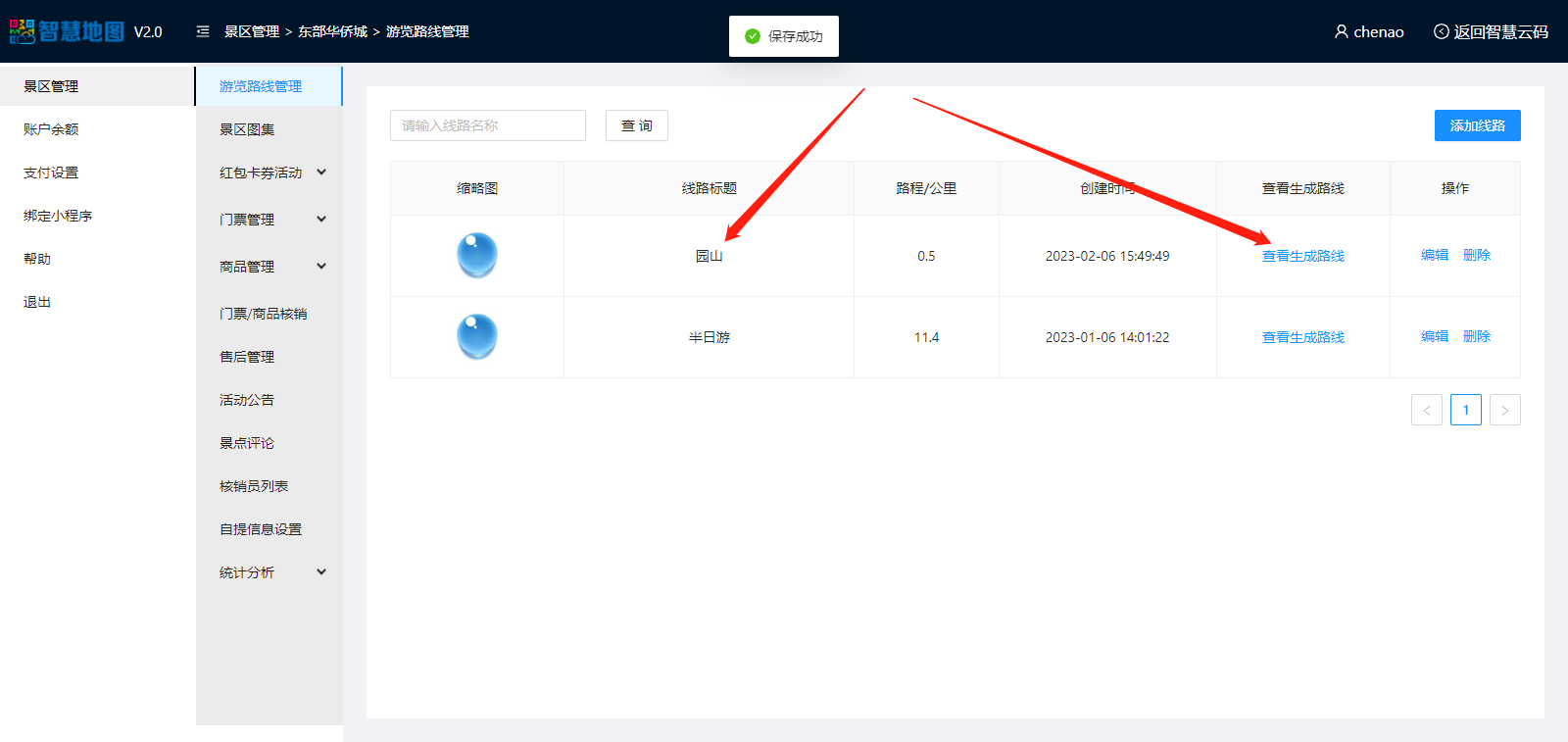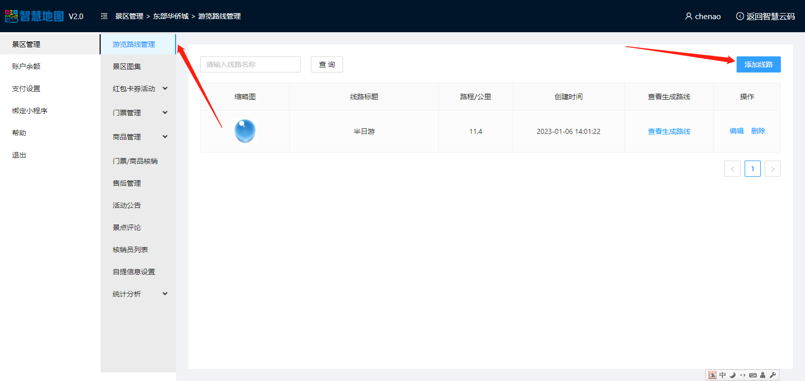 第一步:進入其中一個景區的管理頁面,在左側列表中,點擊游覽路線管理,再次點擊添加線路。如下圖所示: