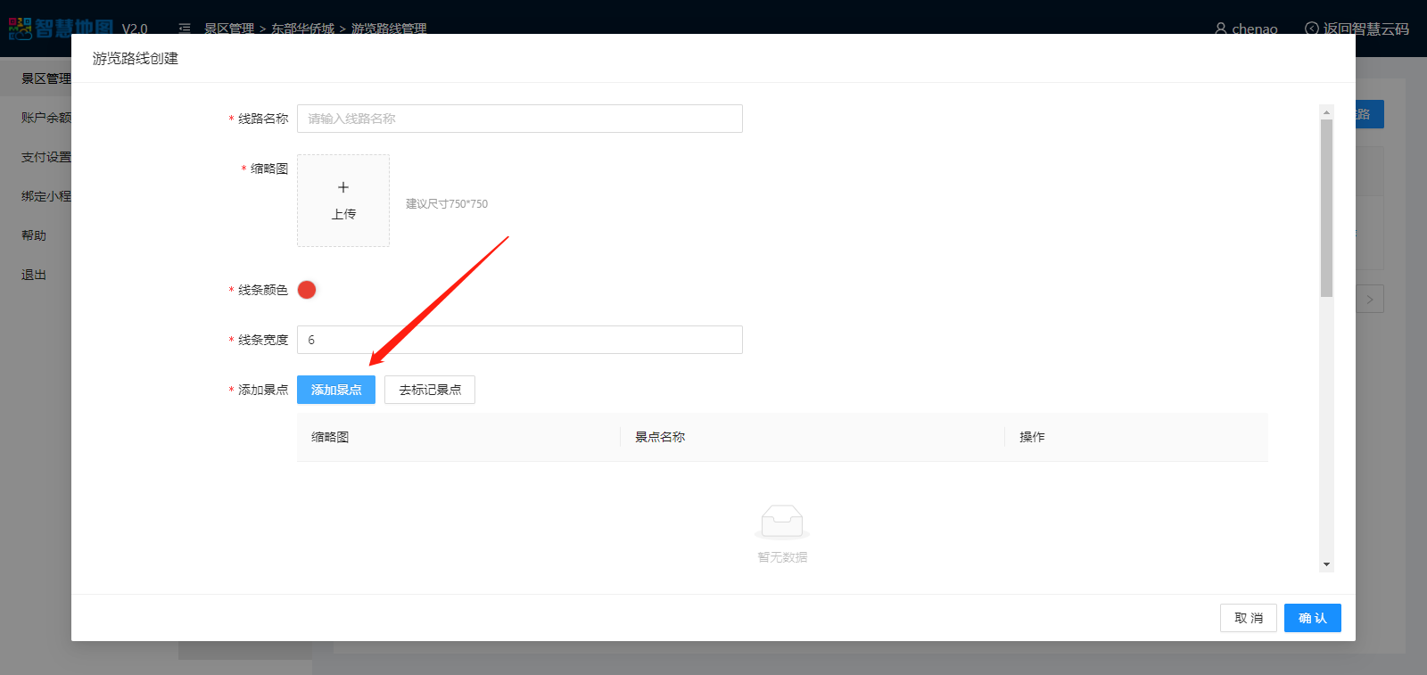 第二步:填寫線路名稱等信息,然后添加景點。如下圖所示: