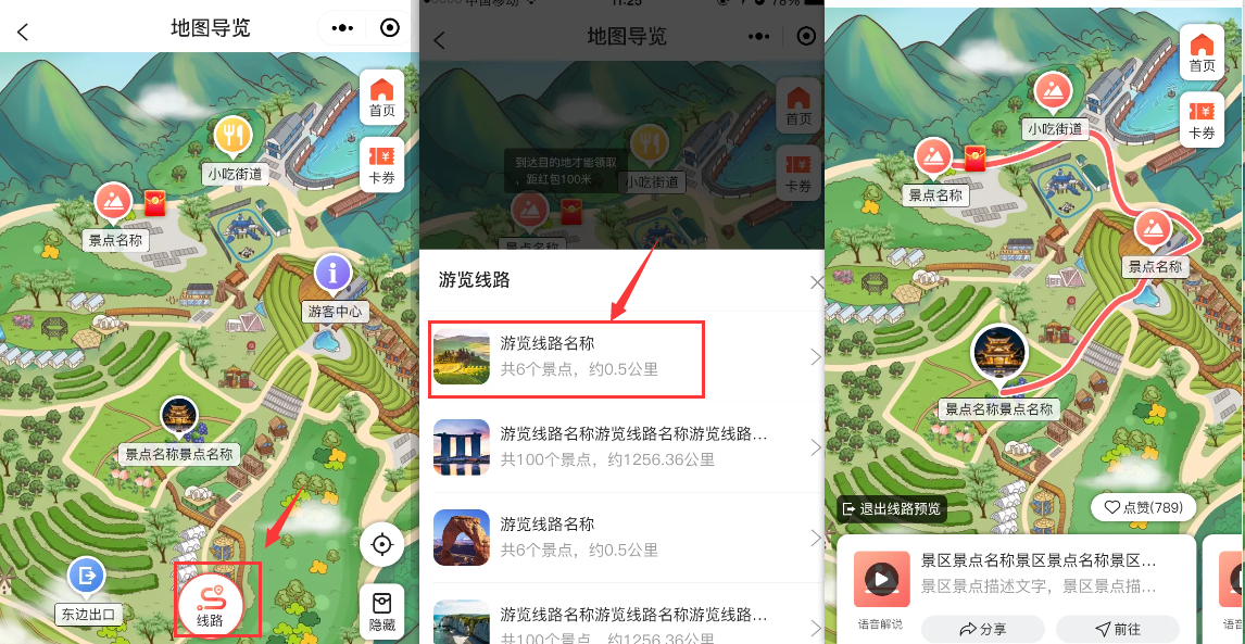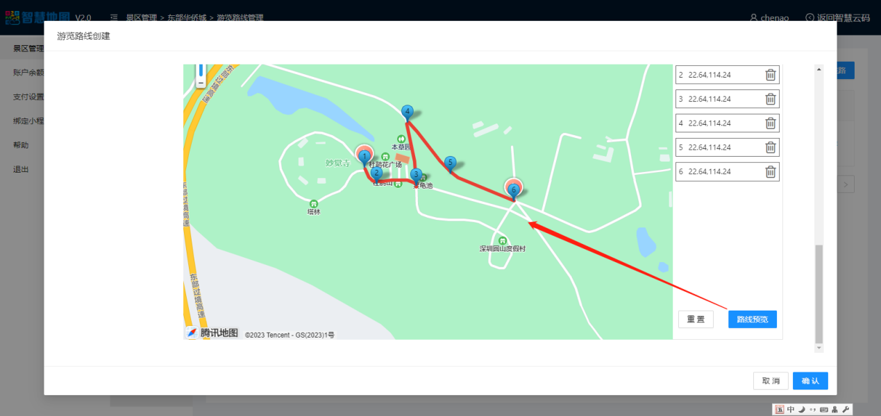 然后在多個景點之間,按順序標記多個坐標,形成自定義的線路(兩個景點之前也要標記多個坐標),點擊路線預覽,生成效果例圖。如下圖所示: