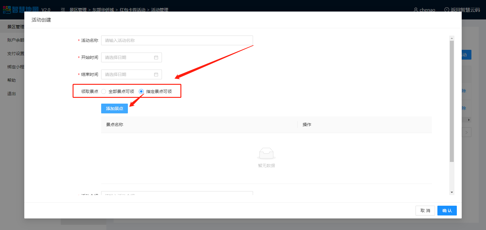 第二步:填寫活動的基本信息等,選擇全部景點或者指定景點可領。選擇指定景點,需同時選擇指定景點。(景點標記的坐標有限范圍,就是景點打卡的有限范圍)。如下圖所示: