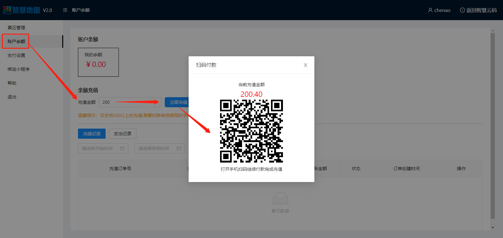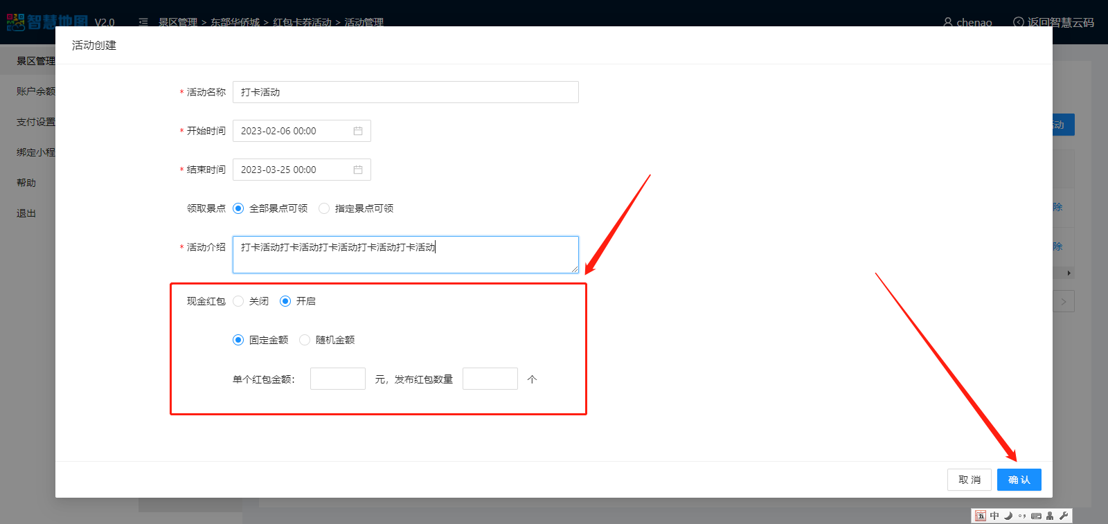 第三步:活動的獎勵分為兩種:卡券和現金紅包。卡券是默認需要的,現金紅包可以自定義開啟/關閉,選擇紅包金額方式,金額數量。然后點擊【確認】按鈕。(如果開啟了現金紅包功能,需要在賬戶余額充值足夠的金額。操作如下,使用微信掃碼支付)。如下圖所示: