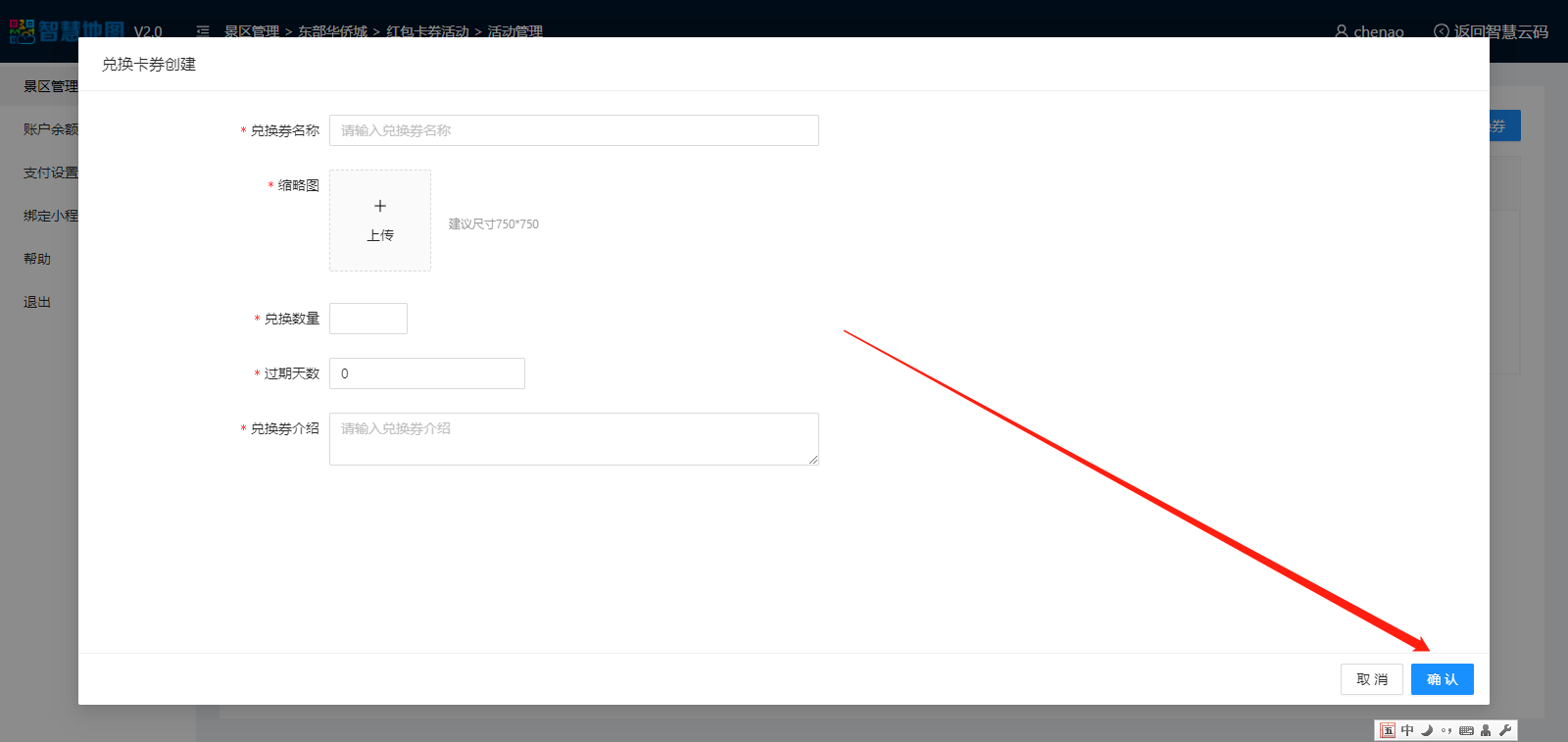 第四步:點擊卡券管理,進行卡券設置。點擊右上角的添加兌換券,填寫完信息后,點擊確認。如下圖所示: