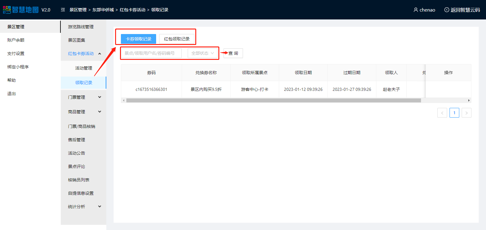 點擊領取記錄,選擇卡券或者紅包領取記錄。可以在下方選擇查詢條件,進行查詢。如下圖所示: