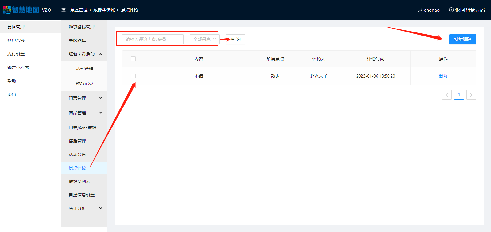 在景區管理下點擊景點評論,可以看到所有的評論。其它的功能