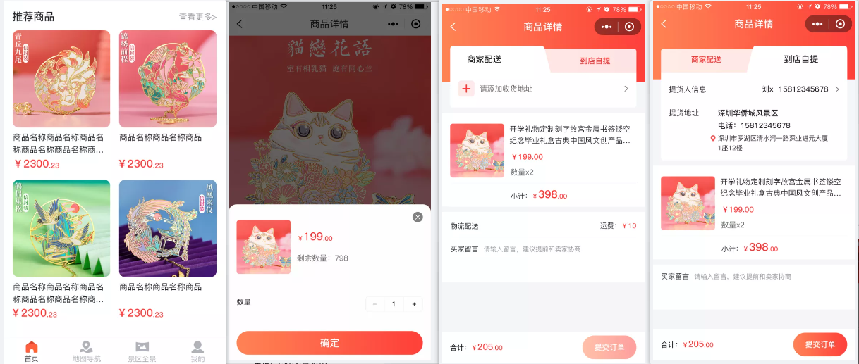 在首頁底部是商品區域,點擊進行購買下單,根據具體情況有物流發貨和到店自提兩種選項,填好信息之后付款即可。如下圖所示: