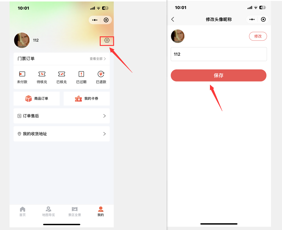 用戶第一次登錄是靜默登錄,在【我的】界面點擊圖中的設置按鈕進行頭像和昵稱的修改,然后點擊保存即可。如下圖所示: