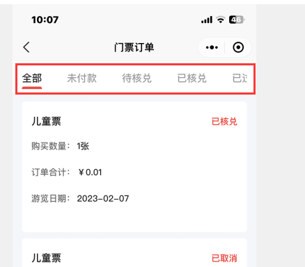 第一步點擊底部導航欄【我的】,第二步點擊【門票訂單】中的各個狀態入口,可以分類查看訂單。也可直接點擊查看全部,查看所有訂單詳情。如下圖所示: