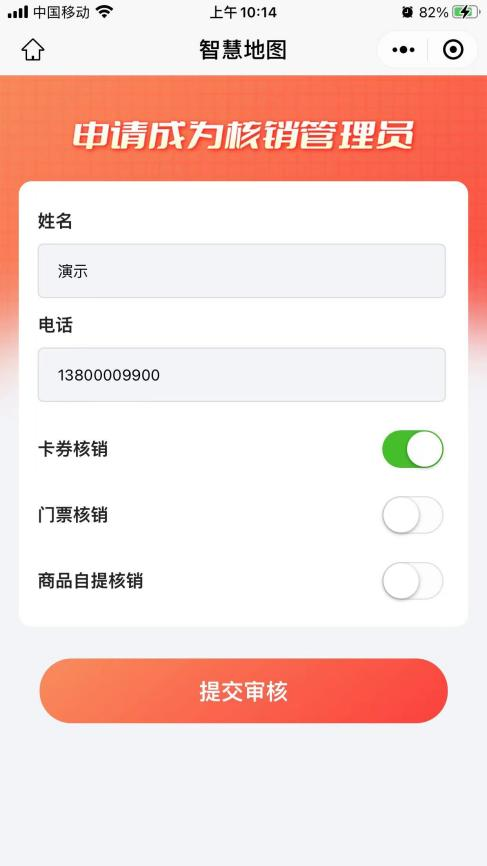 第一步:用戶掃碼管理后臺提供的核銷審核碼;第二步:選擇并提交申請詳情,點擊提交即可。如下圖所示: