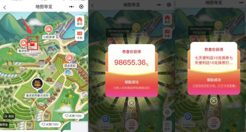 當商家在景點設置了紅包和卡券時,在景點的標記旁邊會有一個紅包圖標。當進入該區域之后點擊便可以領取。當紅包和卡券同時存在時,會隨機發放任意一種。如下圖所示: