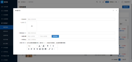 第二步:輸入機構名稱,上傳logo,聯系電話、詳細地址等必填項,地圖設置點擊“選擇地址”,可在打開的小地圖選擇地點。點【提交數據】保存,就可以新建一個組織機構。如下所示: