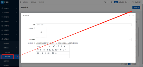 第一步:菜單欄的助農振興-政策動態-政策分類,點擊【添加分類】,填寫分類名稱等信息,