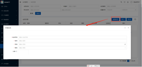 第三步:(針對沒有登陸注冊過的人員,可手動后臺添加會員帳號):菜單欄的會員管理-會員列表,點擊【新增會員】,填寫電話號碼、昵稱、密碼等信息。如下所示: