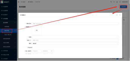 第二步:添加景點。菜單欄的鄉村旅游-景點管理-景點列表,點擊【添加景點】,填寫景點信息、開放時間、核銷密碼等信息,然后點擊【保存并去門票設置】。