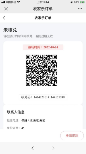 第一步:下單的用戶在手機端農家樂訂單中打開核對碼。如下所示: