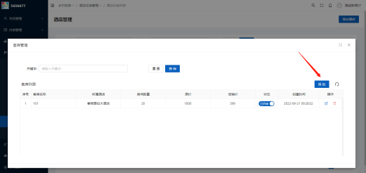 第三步:進入客房管理界面(也可以在酒店住宿列表的客房管理進入),點擊【添加】,填寫客房名稱、價格、房間數、可住人數等信息,然后再點擊【確定】。如下所示: