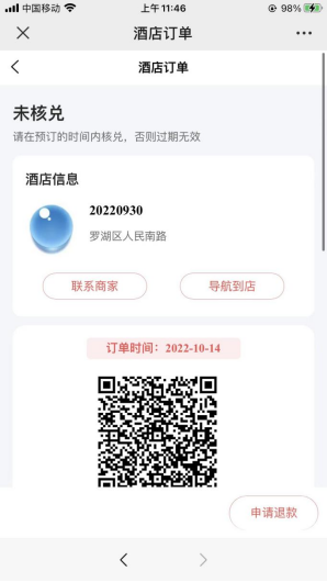 第一步:下單的用戶在手機端酒店住宿訂單中打開核對碼。如下所示: