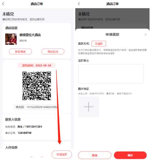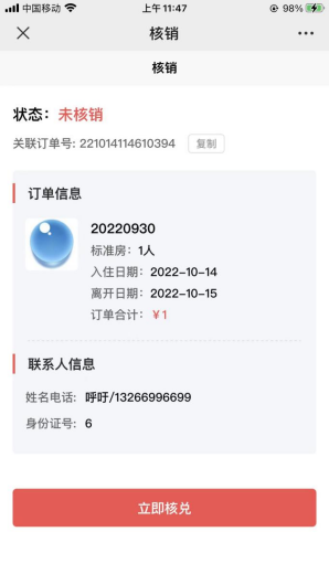 注:核銷密碼是用酒店住宿時,核銷客房使用的。如下所示: