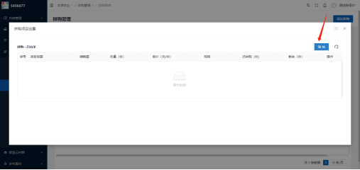 第二步:上一步點擊“保存并設置拼購項目”后,進入拼購項目設置界面(也可以在拼購列表的拼購項目進入),點擊【添加】,填寫項目標題、總量、單價、規格等信息。點擊【確定】后,新增拼購完成。如下所示: