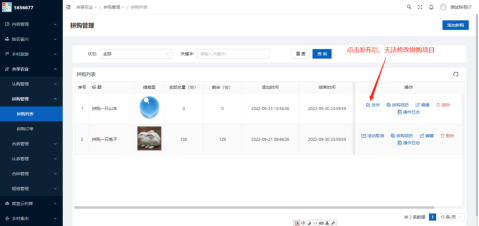 第三步:發布。在拼購列表,每個拼購項目后面都有一個【發布】按鈕(如果點擊了發布,就變成【活動取消】)需要注意:點擊發布后,拼購項目里面的項目是無法修改的,需確認無誤后,才能點擊發布。如下所示: