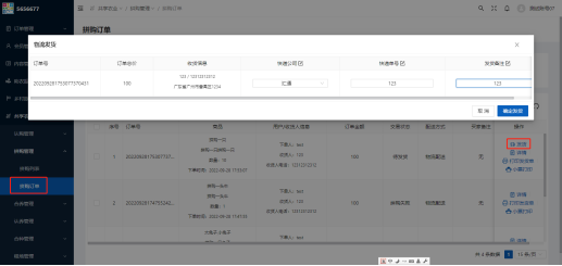 第一步:點擊顧客已支付的拼購訂單,點擊【發貨】。選擇快遞公司并輸入快遞單號,點擊【確認發貨】。如下所示:
