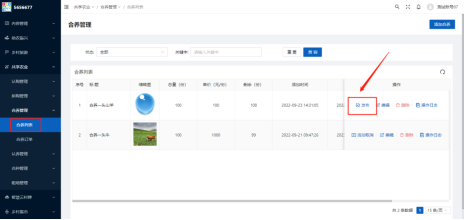 第二步:發布。在合種列表,每個合種項目后面都有一個【發布】按鈕(如果點擊了發布,就變成【活動取消】),需要注意:點擊發布后,合種項目里面的部分選項是無法修改的,需確認無誤后,才能點擊發布。如下所示: