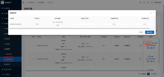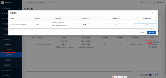 第一步:點擊顧客已支付的認養訂單,點擊【發貨】。選擇快遞公司并輸入快遞單號,點擊【確認發貨】。如下所示: