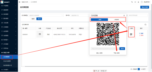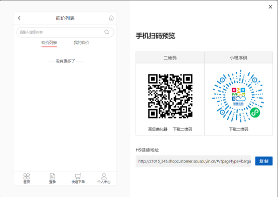 管理后臺分享:是通過管理后臺的產品二維碼進入,任何一個產品后面,有一個二維碼,點擊后,會彈出一個窗口,方法跟編輯器一樣,都是有二維碼、小程序碼、H5鏈接地址可分享。如下所示: