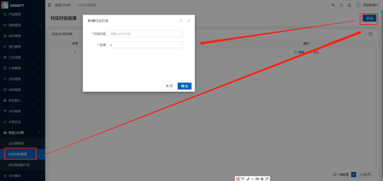 菜單欄的智慧云村牌-村莊村名管理,點擊右上角的【添加】,填寫村名,點擊【確定】,即添加完成。如下所示: