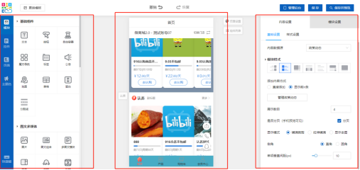 編輯器的頁面分布,左邊的組件區、中間的編輯區、右邊的設置區。如下所示: