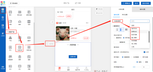 第二步:進入編輯器后,選擇模塊-信息產品-內容列表,在內容數據源里,選擇自己想要的數據源。(數據源包含助農振興的組織機構、政策動態、助農對象、愛心捐款)如下所示: