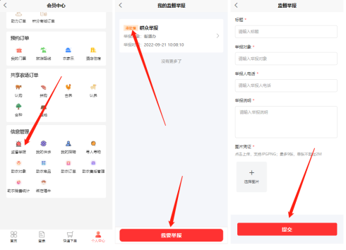 在手機端的個人中心,拉到最下方,找到信息管理-監督舉報。點擊進去了,可以看到之前提交的監督舉報及其進度。點擊最下方的“我要舉報”,根據情況填寫信息,上傳圖片,最后點擊“提交”。如下所示: