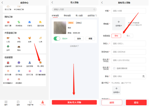 在個人中心-信息管理-尋人尋物,點擊發布尋人尋物,填寫對應的信息,點擊提交。如下所示: