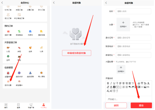 在個人中心-信息管理-助農對象,點擊申請成為助農對象,填寫對應的信息,點擊提交。如下所示: