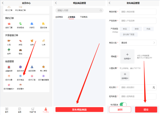在個人中心-信息管理-助農商品,點擊發布幫扶商品,填寫對應的信息,點擊提交。如下所示: