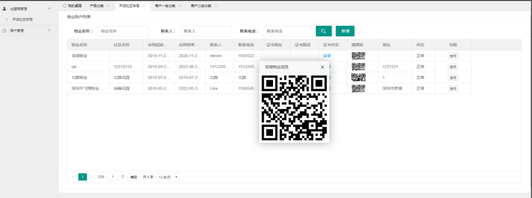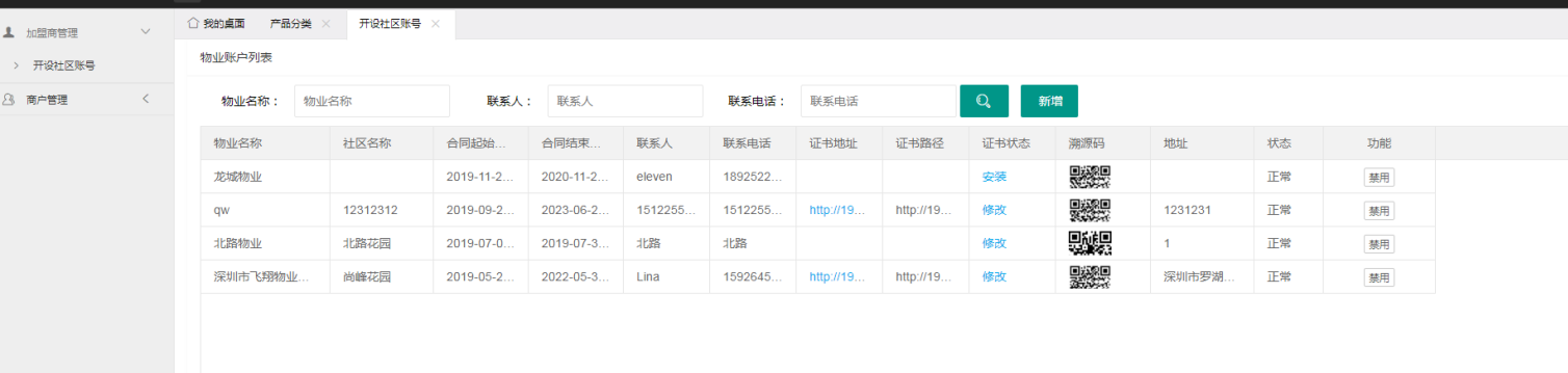 加盟商管理主要開通和禁用加盟商的賬號,并對加盟商的信息進行記錄和掃碼進入H5端。如下圖所示: