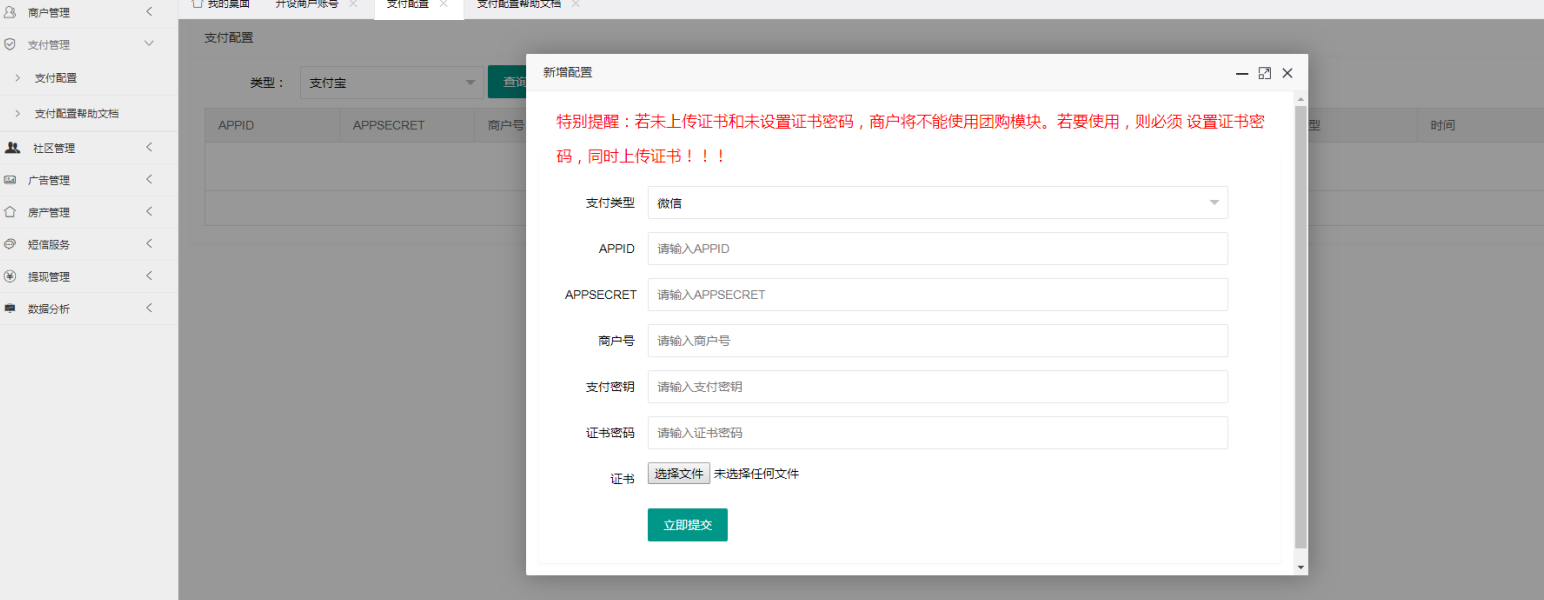 特別提醒:若未上傳證書和未設置證書密碼,商戶將不能使用團購模塊。若要使用,則必須 設置證書密碼,同時上傳證書!!!