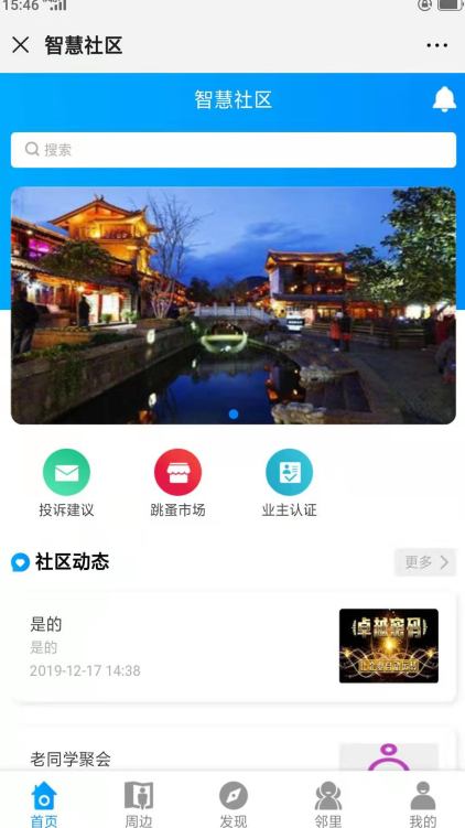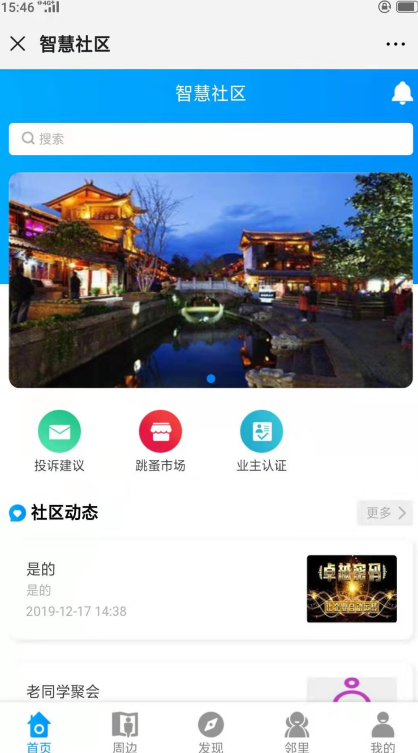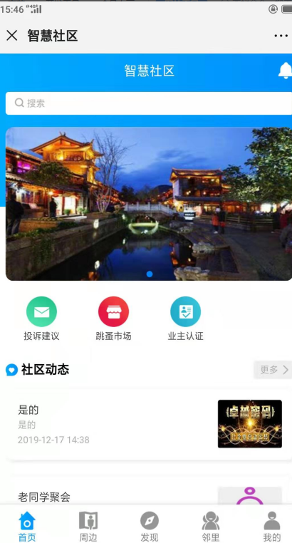 社區管理主要分為社區動態,業主管理,認證管理,投訴建議,跳蚤市場,鄰里動態。如下圖所示: