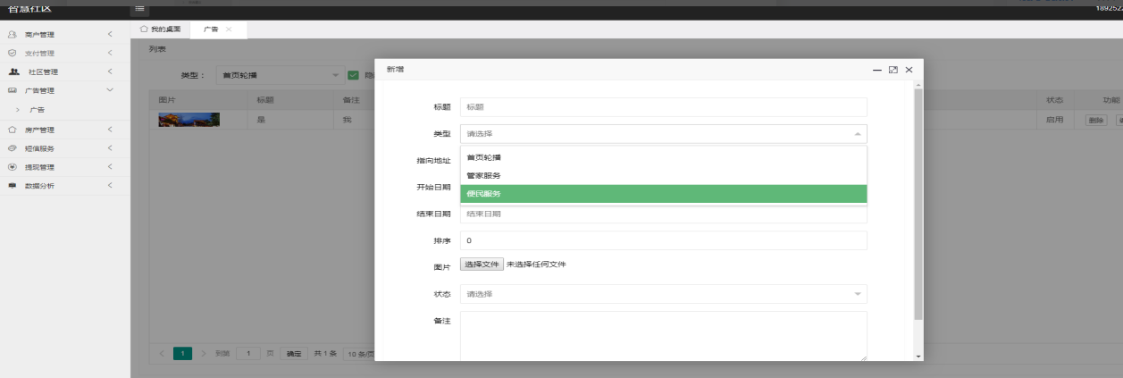 廣告管理主要是為前臺的首頁、管家服務、便民服務添加廣告輪播圖。如下圖所示: