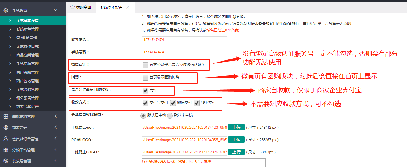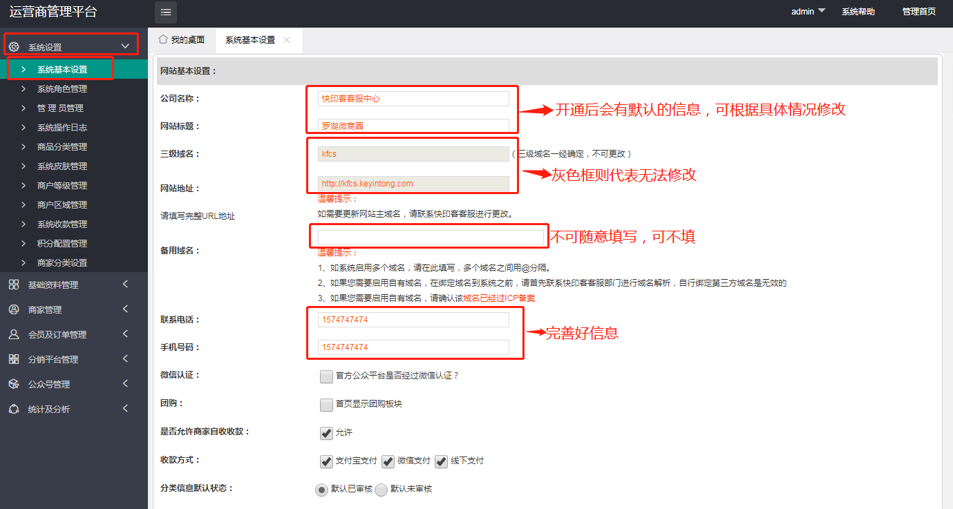 2.1:點擊系統(tǒng)基本設(shè)置,便可開始設(shè)置網(wǎng)站基本信息內(nèi)容:網(wǎng)站標(biāo)題、聯(lián)系電話、PC端LOGO將顯示在商家PC端后臺登陸頁面。可根據(jù)實際情況進行修改。具體操作設(shè)置如下圖所示: