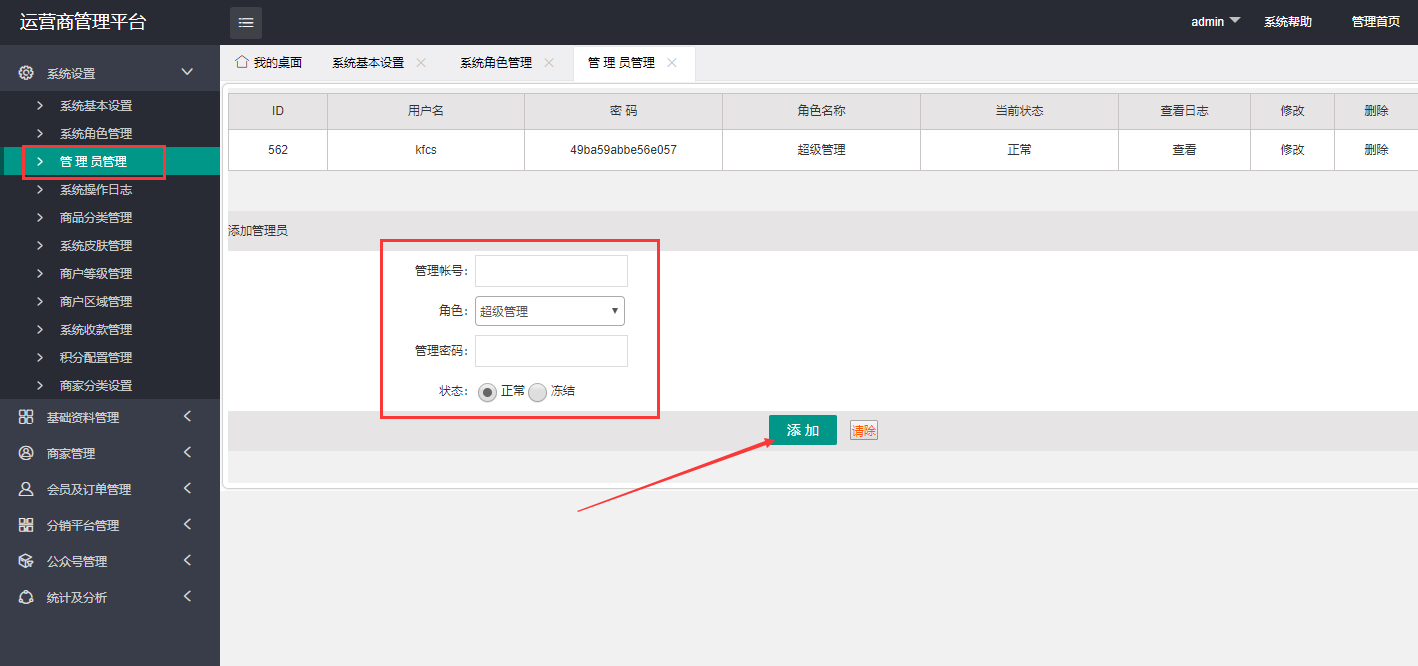 系統(tǒng)角色添加后,可對應(yīng)添加具體的管理員信息,將其劃分到對應(yīng)的角色下,就有其角色下對應(yīng)勾選上的權(quán)限了。可添加多個相同角色的管理員,但請不要設(shè)置簡單密碼,以免造成數(shù)據(jù)丟失、損壞。如下圖所示: