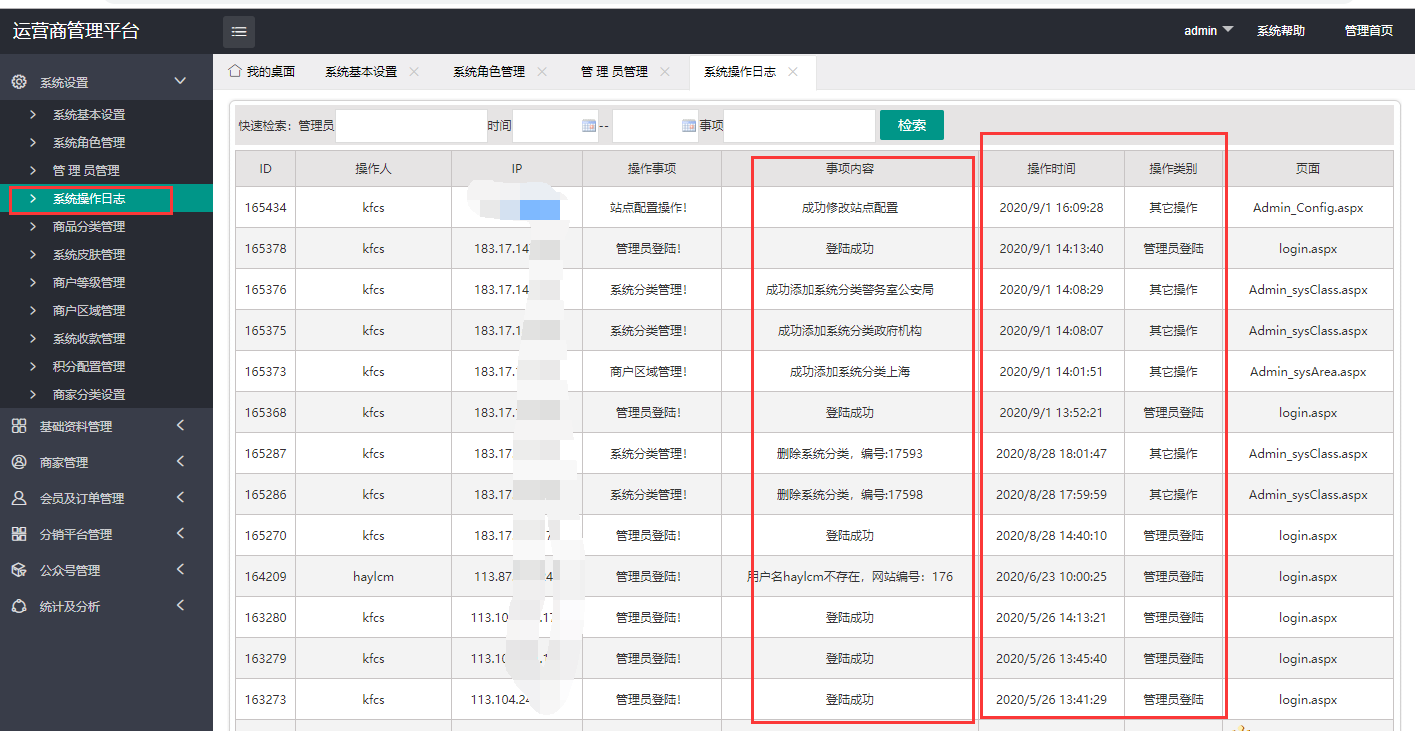 可以在此處查看各管理賬號的詳細(xì)操作日志。包括其操作事項、登陸IP、操作時間、類別、頁面等信息方便了解各管理員的操作情況,辨別操作是否合法。如下圖所示:
