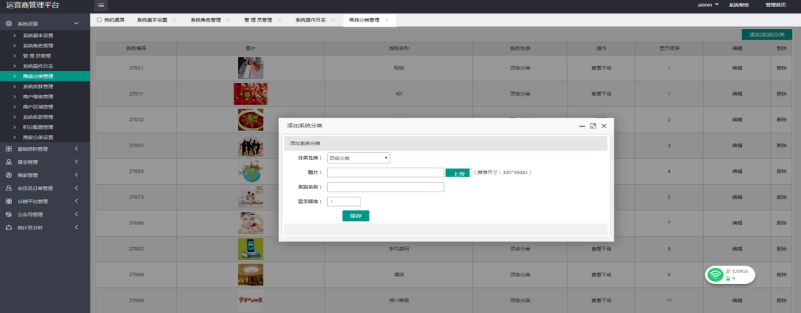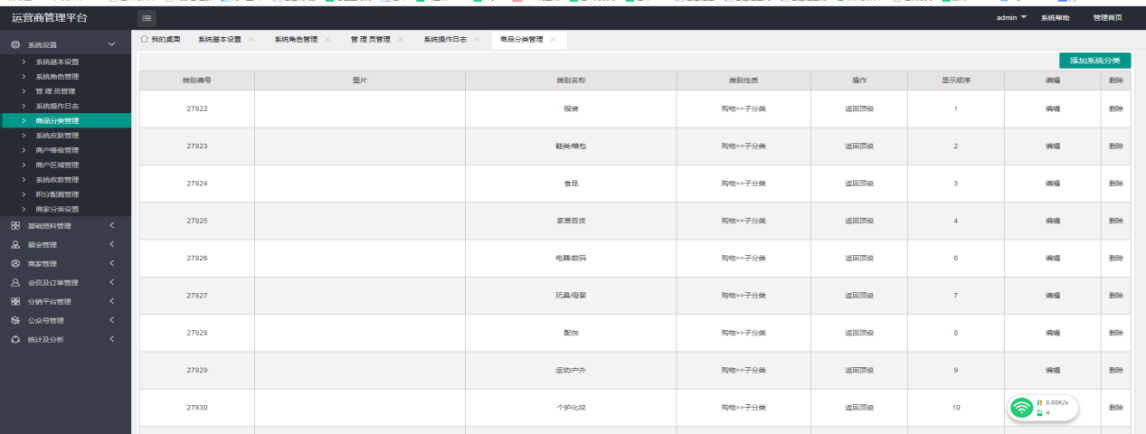 商品分類管理是用來添加商家產(chǎn)品的分類以及分類下的子項,運營商后臺可自定義。如下圖所示: