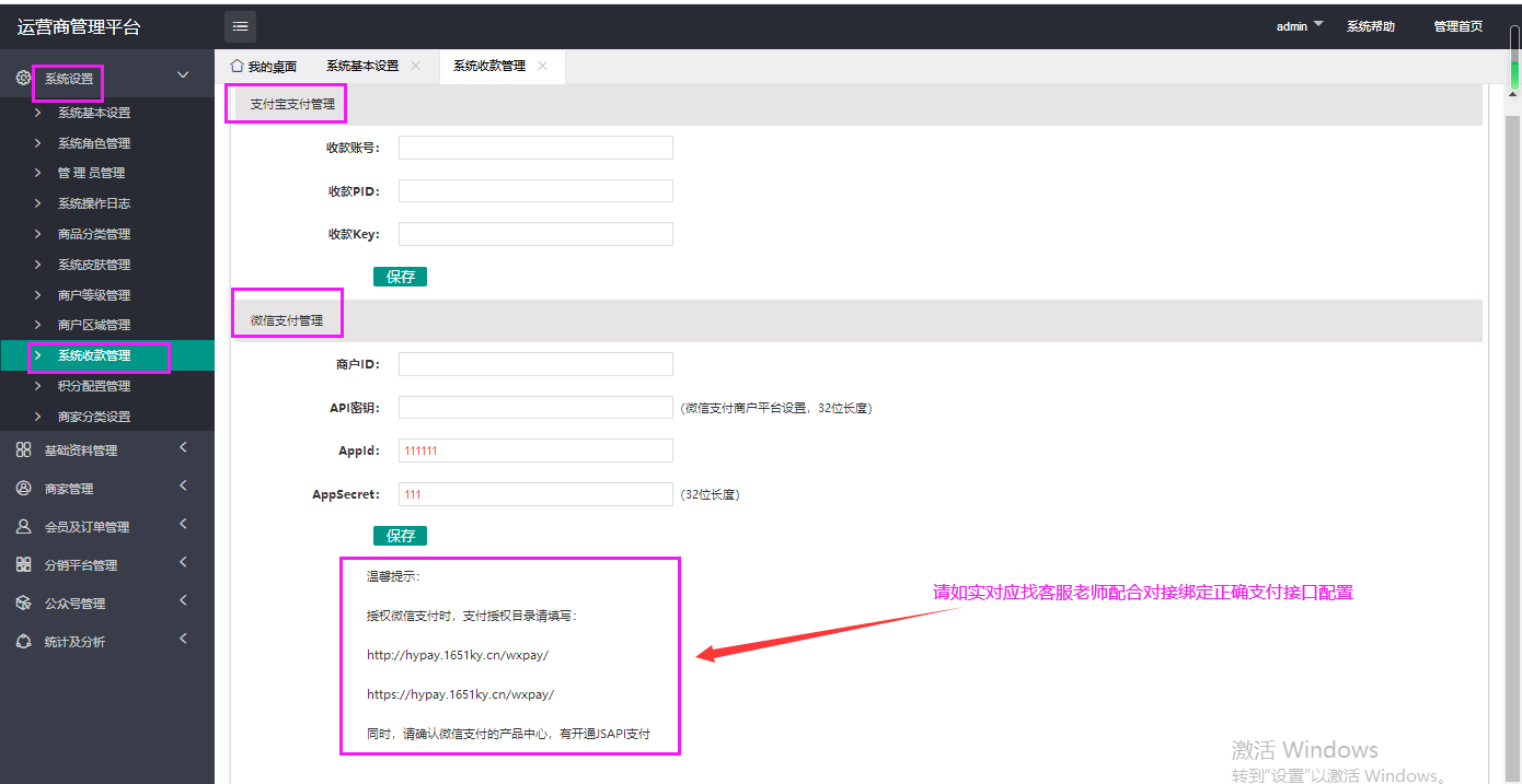 系統(tǒng)收款管理主要是用來配置系統(tǒng)支付,可以配置支付寶支付,微信支付。建議使用微信支付,而支付寶支付,有必須需求的可再申請,2種綁定方式均需要客服老師協(xié)助。如下圖所示: