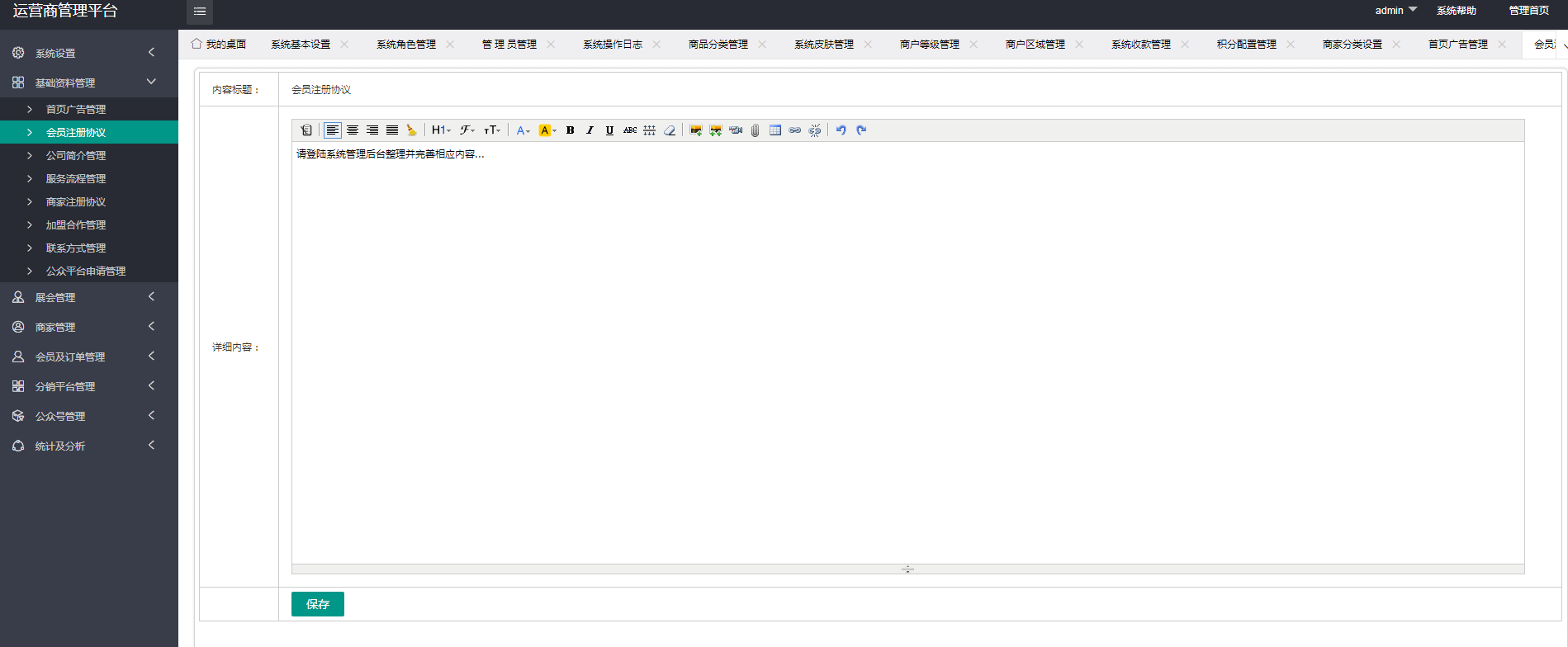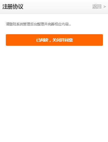 會員注冊協(xié)議則是給到會員注冊時閱讀的協(xié)議內(nèi)容,一旦注冊,默認(rèn)已經(jīng)了解本協(xié)議,您可根據(jù)需要,編寫修改相應(yīng)的內(nèi)容。如下圖所示:
