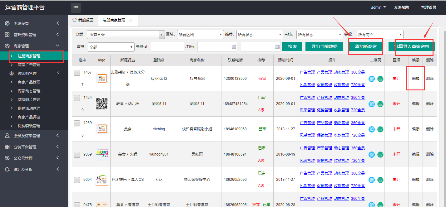 此界面顯示所有商家列表,可在此處查看所有已注冊商家,并可對商家的廣告、產(chǎn)品、新聞動態(tài)、商家風(fēng)采、商家促銷進行管理。也可以審核通過首頁免費入駐按鈕進行申請的商家。同時可通過表格導(dǎo)入商家或地圖定位導(dǎo)入附近商家。收款管理則是啟用商家自收收款后,商家進行綁定企業(yè)支付寶賬號!而360全景和720全景則是商家店鋪首頁有全景入口,添加方式和智慧云碼一致。注意:商家必須要進行審核,否則商家和產(chǎn)品均不會顯示。如下圖所示: