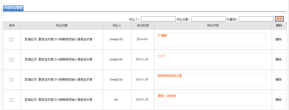 平臺運營商可在此管理所有產(chǎn)品的評論,并可根據(jù)關(guān)鍵詞、評論人、評論對象(產(chǎn)品)進行搜索查找;亦可由平臺運營商或商家管理后臺直接刪除某條評論; 商家產(chǎn)品,不購買產(chǎn)品也可以直接評論,謹(jǐn)防商家競爭對手惡意評價,經(jīng)常查看并維護評論的好評度。如下圖所示: