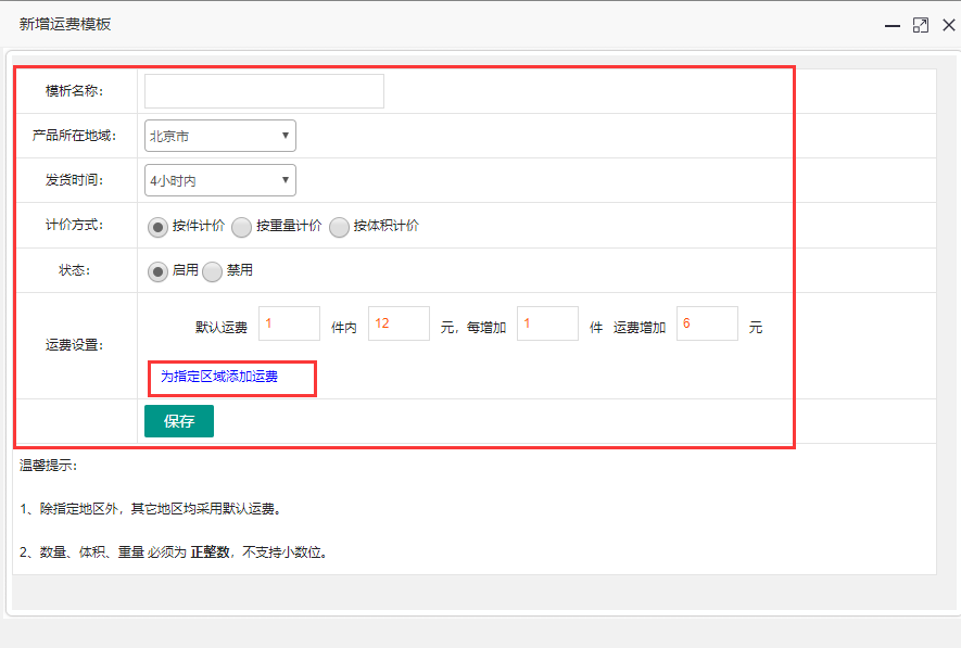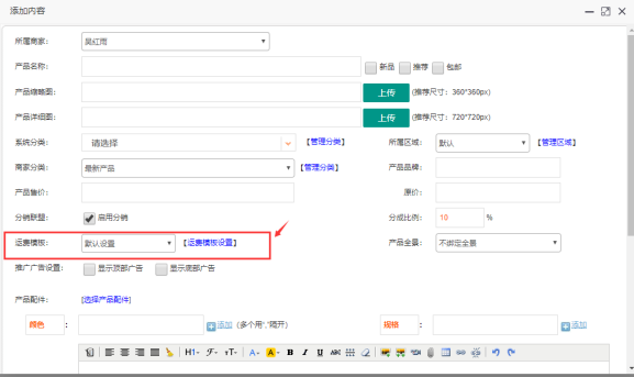運費設(shè)置,運費沒有單獨版塊設(shè)置,所有運費規(guī)則均在商家產(chǎn)品管理的運費模板設(shè)置。如下圖所示: