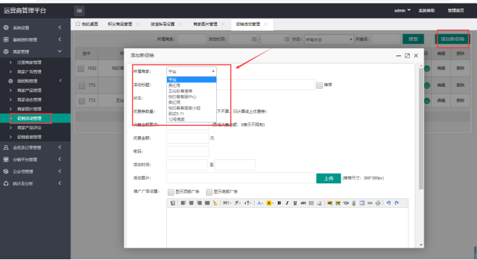 所有商家商鋪的幻燈片廣告列表!商家通過商家后臺上傳的幻燈片廣告也會統(tǒng)一出現(xiàn)在這個頁面,同時作為平臺運營商,也可以直接進行添加商家的幻燈片廣告。如下圖所示: