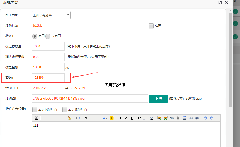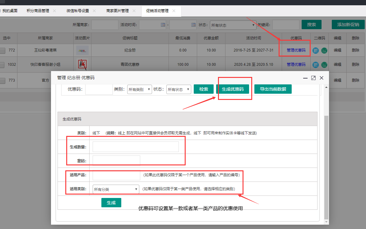 而線下優(yōu)惠碼,則通過設(shè)置數(shù)量+設(shè)置密碼生成對應(yīng)的優(yōu)惠碼數(shù)據(jù),將優(yōu)惠碼信息填寫到紙質(zhì)的優(yōu)惠券上,將密碼使用涂層覆蓋,線下推廣宣傳時,可派發(fā)給到不知道本商圈平臺的消費者使用。后臺添加如下圖所示: